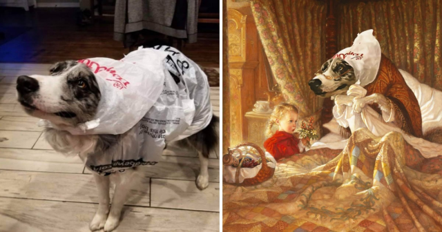 Хозяйка надевает пакеты на свою собаку, чтобы та не вымокла во время прогулки под дождём