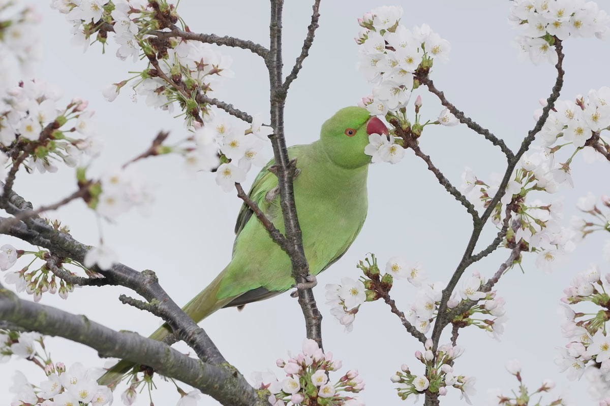 Попугай собирает цветущую вишню в парке Баттерси в Лондоне, Англия. (Фото Kin Cheung):