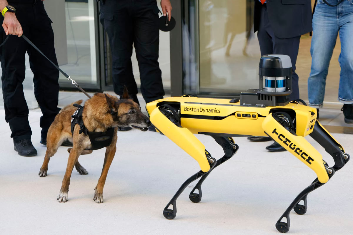 Полицейская собака из подразделения RAID французской национальной полиции, специализирующаяся на поиске взрывчатых веществ, осматривает собаку-робота Boston Dynamics в инновационном центре CMA CGM Tangram в Марселе, Франция. (Фото Ludovic Marin):