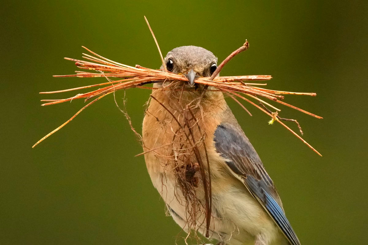 Самка восточной синей птицы держит пучок палочек и сосновых иголок, которыми она обстилает скворечник во Фрипорте, штат Мэн. (Фото Robert F. Bukaty):