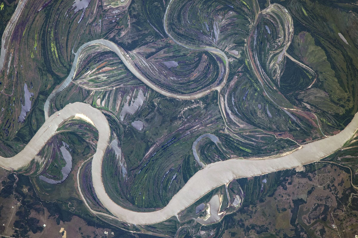Вид на извилистый рельеф вокруг реки Парагвай, сфотографированный бортинженером 70-й экспедиции Жасмин Могбели, когда МКС находилась на орбите на высоте 263 миль над землей. (Фото Jasmin Moghbeli / NASA):