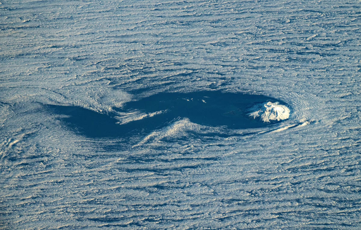 Вихри образуются, когда ветер гонит облака мимо острова в Южном океане. (Фото NASA):