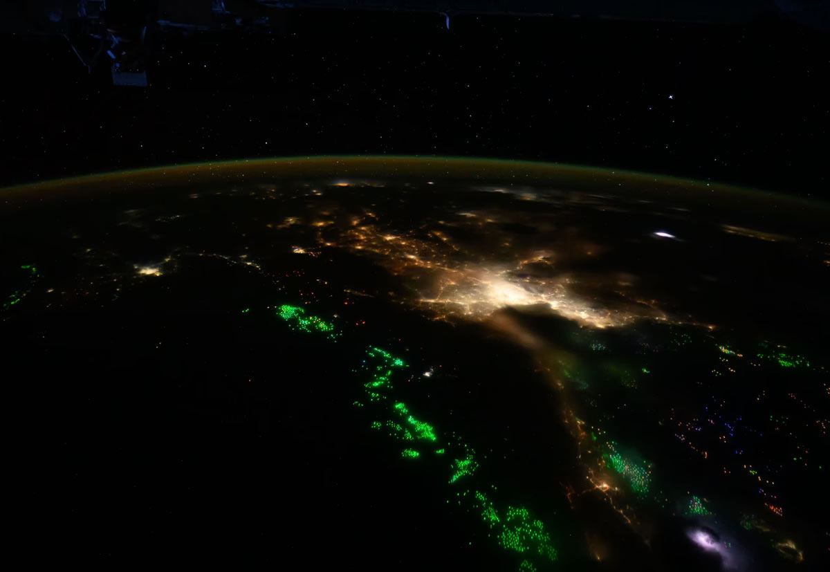 Огни города Бангкока, Таиланд, и его пригородов контрастируют с зелеными огнями рыбацких лодок в Сиамском заливе и Андаманском море. (Фото NASA):