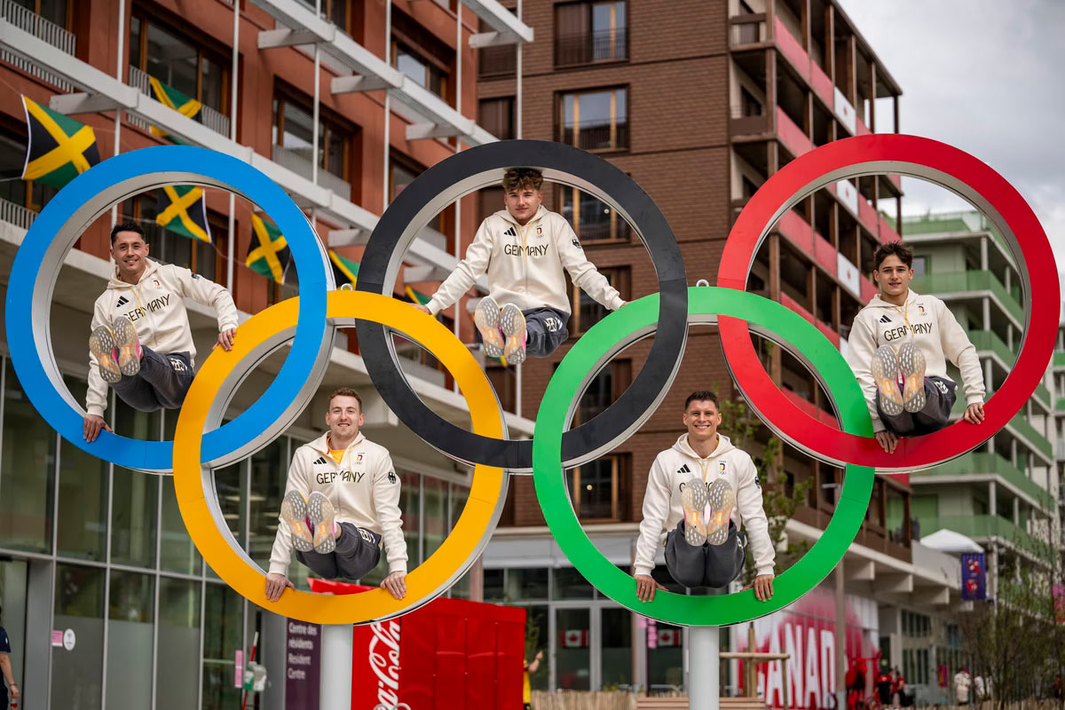 Немецкие гимнасты Андреас Тоба, Нильс Дункель, Паскаль Брендель, Лукас Даузер и Тимо Эдер позируют на олимпийских кольцах в Олимпийской деревне 23 июля 2024 года в Париже. (Фото Kevin Voigt):