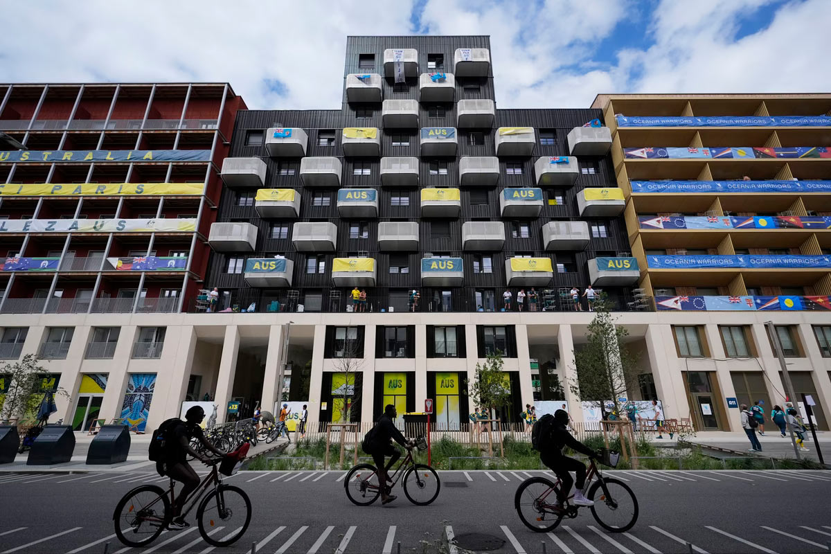 Люди катаются на велосипедах перед резиденцией сборной Австралии в Олимпийской деревне, 23 июля 2024 года. (Фото Rebecca Blackwell):