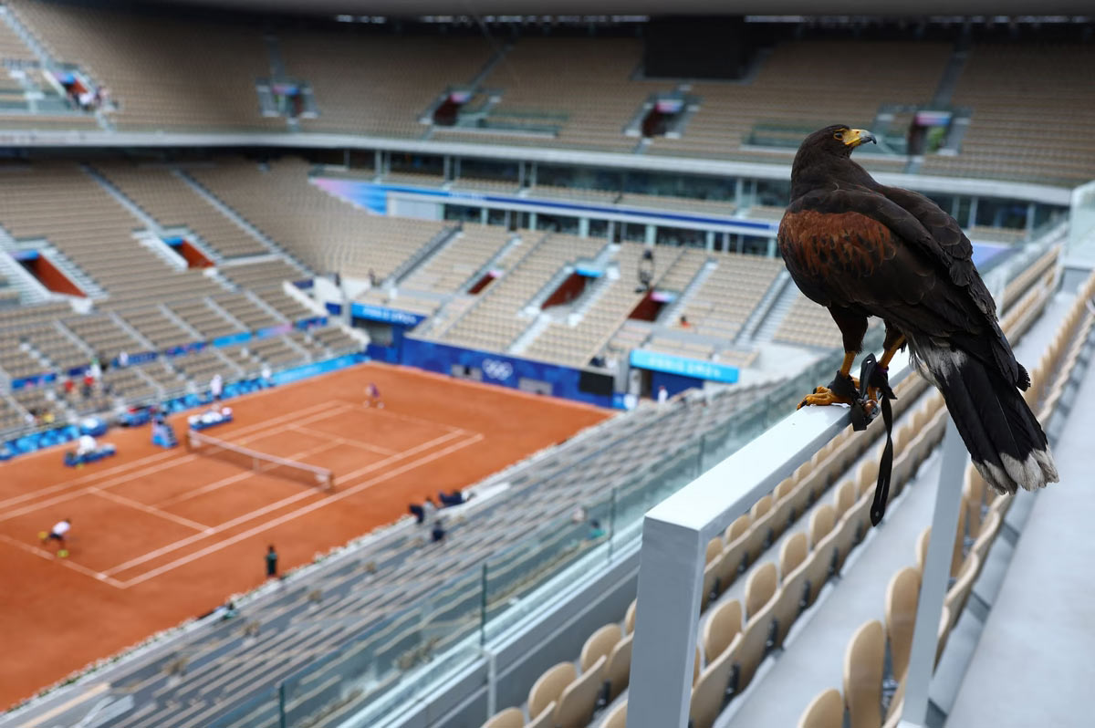 Сокол, охотящийся на голубей, сидит на стадионе Ролан Гаррос в Париже, 24 июля 2024 года. (Фото Edgar Su):