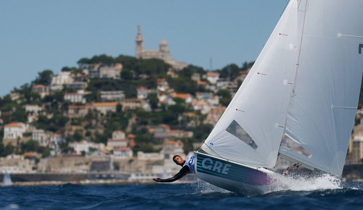Член сборной Греции по парусному спорту тренируется в марине Марселя, Франция, 24 июля 2024 года. (Фото Lisi Niesner):