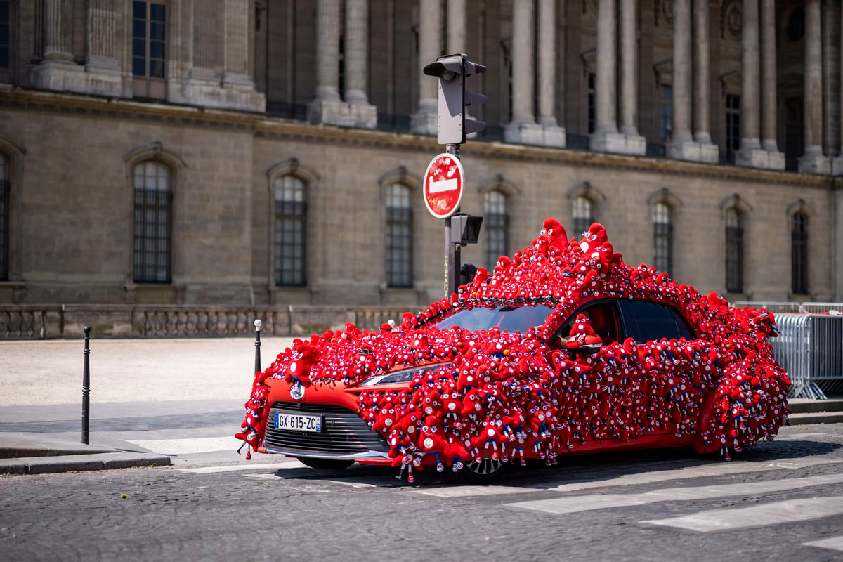 Автомобиль, украшенный плюшевыми версиями Олимпийского Фрижа, талисмана Олимпийских игр 2024 года в Париже, возле Лувра 19 июля 2024 года. (Фото Kevin Voigt):