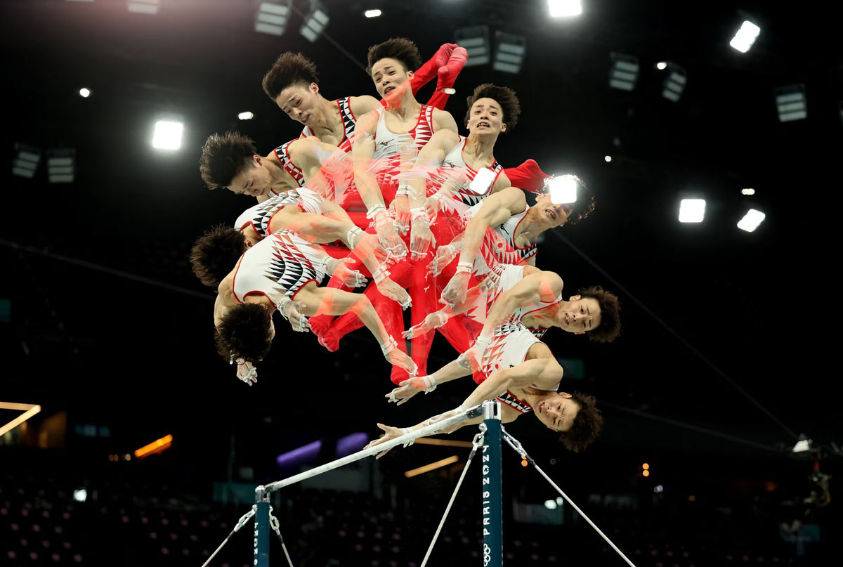 Снимок с мультиэкспозицией гимнастки из Японии, тренирующейся на арене Берси в Париже, 24 июля 2024 года. (Фото Mike Blake):
