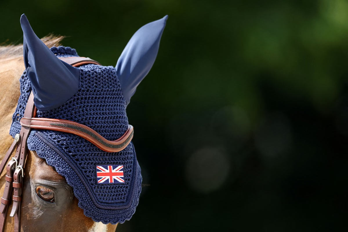 Лошадь сборной Великобритании во время тренировки в Шато де Версаль 24 июля 2024 года. (Фото Kai Pfaffenbach):