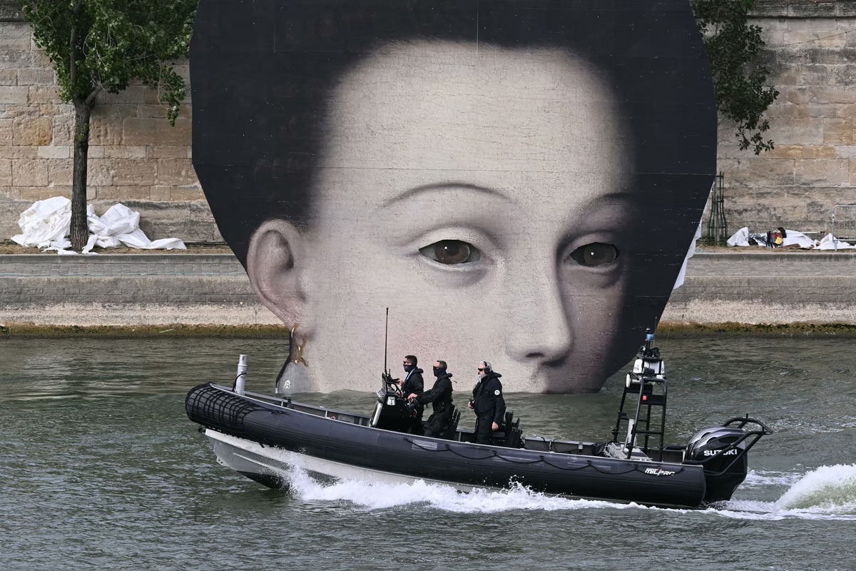Члены службы безопасности патрулируют на лодке вдоль реки Сены перед церемонией открытия Олимпийских игр 2024 года в Париже, 23 июля 2024 года. (Фото Sebastien Bozon):