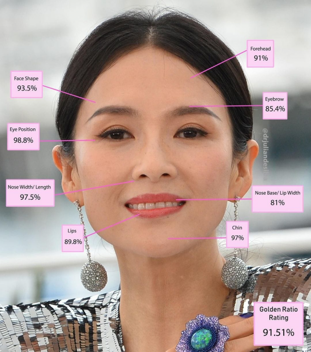 45-летняя китайская актриса имеет ещё более близкое к идеалу расположение глаз и почти идеальный подбородок.