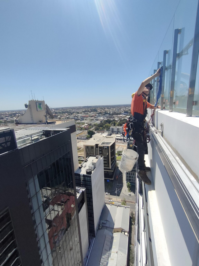 Вот как мы очищаем металлическую конструкцию снаружи стеклянной балюстрады