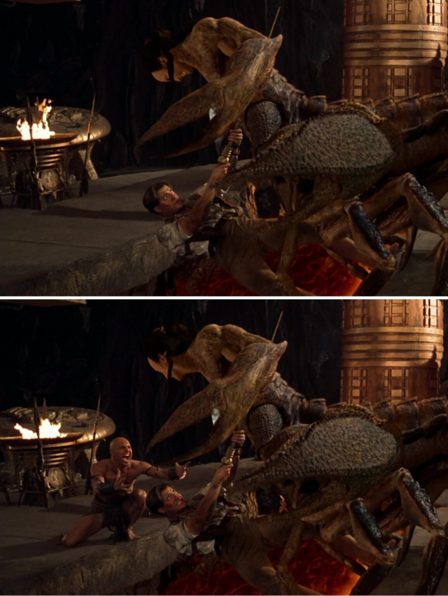 Верховный жрец сильно расстроился, когда герой Брэндана Фрейзера пронзил Царя Скорпионов, и вскричал довольно драматически, но постановка этого момента с комичным вбеганием в кадр, а уже потом криком, да ещё и с протянутыми руками, мешает зрителю прочувствовать горечь обречённого Имхотепа. Вместо этого хочется смеяться!