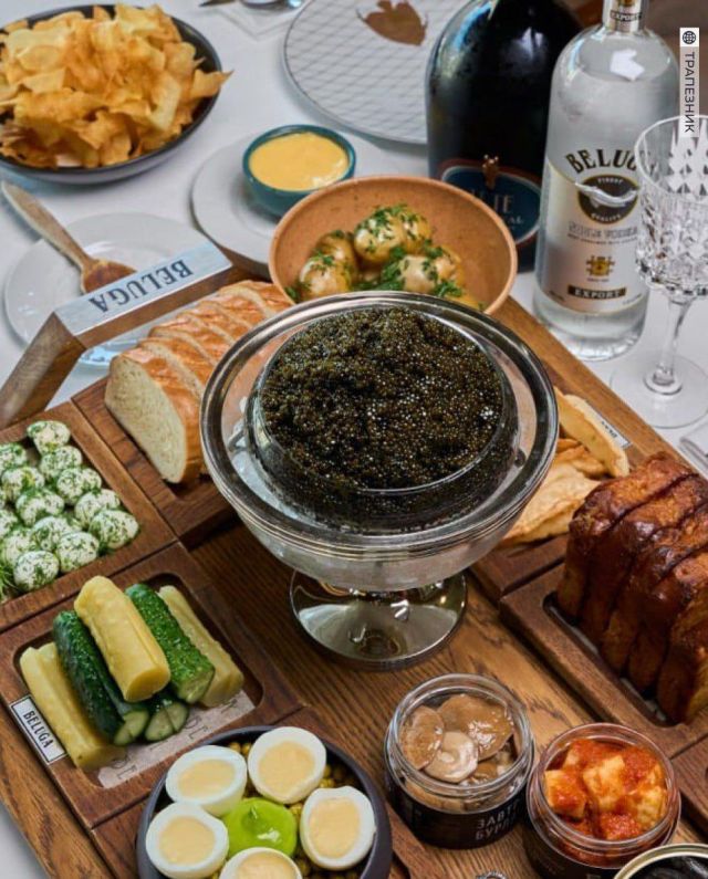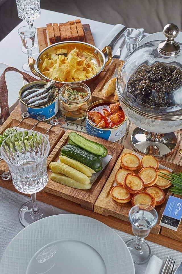 Итак, в меню входят килограмм осетровой икры, литр водки, картошка с укропом, маринованные грибы, малосольные огурцы, яйца с майонезом и другие «деликатесы», такие как килька и расстегай. Самое то, что правильно начать день... и сразу его закончить.