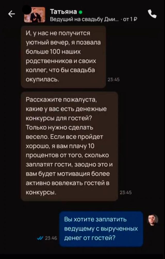 Свадьба - это один из самых запоминающихся дней молодой пары. Но маме, как говорится, виднее! Матушка жениха решила оперативно найти для свадьбы ведущего. Но вместо обычной оплаты, она предложила ведущему процент от подарков гостей. Более того, она даже запретила ему общаться с молодоженами. Тамада отказался... эх, а план ведь был надежен, как швейцарские часы!