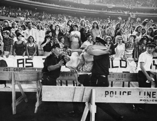 Полицейские успокаивают поклонницу The Beatles на концерте в Нью-Йорке, 23 августа 1966 года.