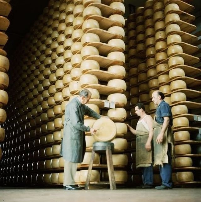 Рабочие на складе проверяют сырное колесо пармезана, Парма, Италия, 1960-е годы