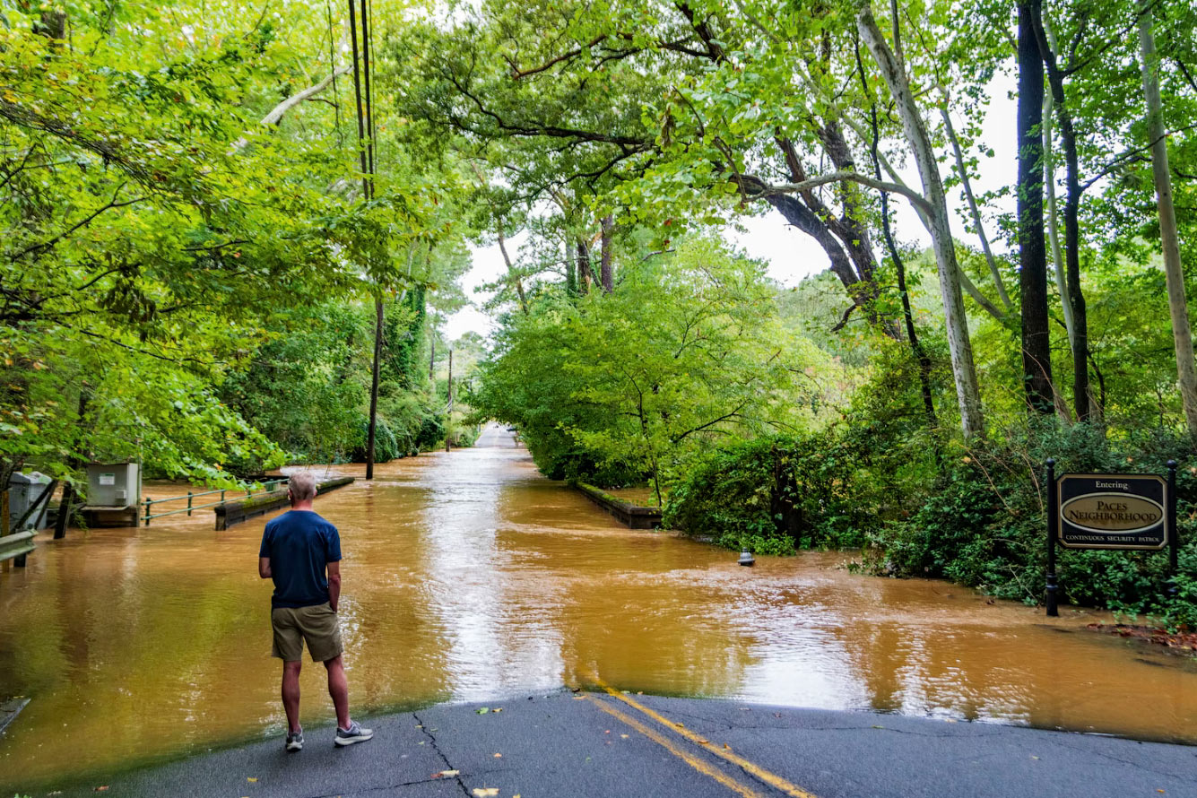 Человек смотрит на наводнение, вызванное ураганом «Хелен» в районе Пейсес в Атланте. (Фото Jason Allen):