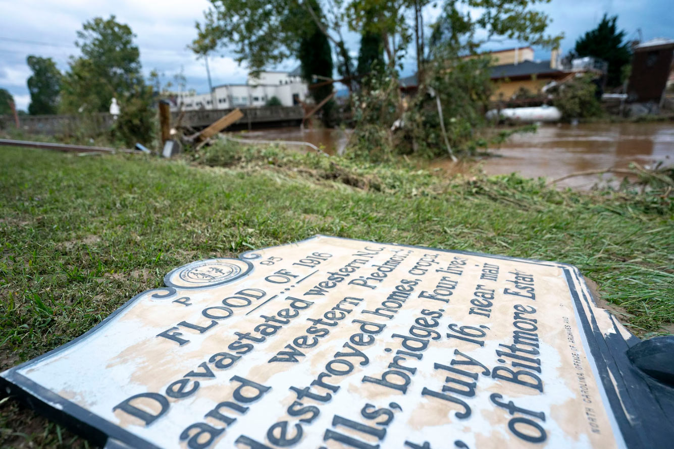 Знак, напоминающий о наводнении 1916 года, лежит на земле рядом с затопленным водным путем недалеко от деревни Билтмор в Эшвилле, Северная Каролина. (Фото Sean Rayford):
