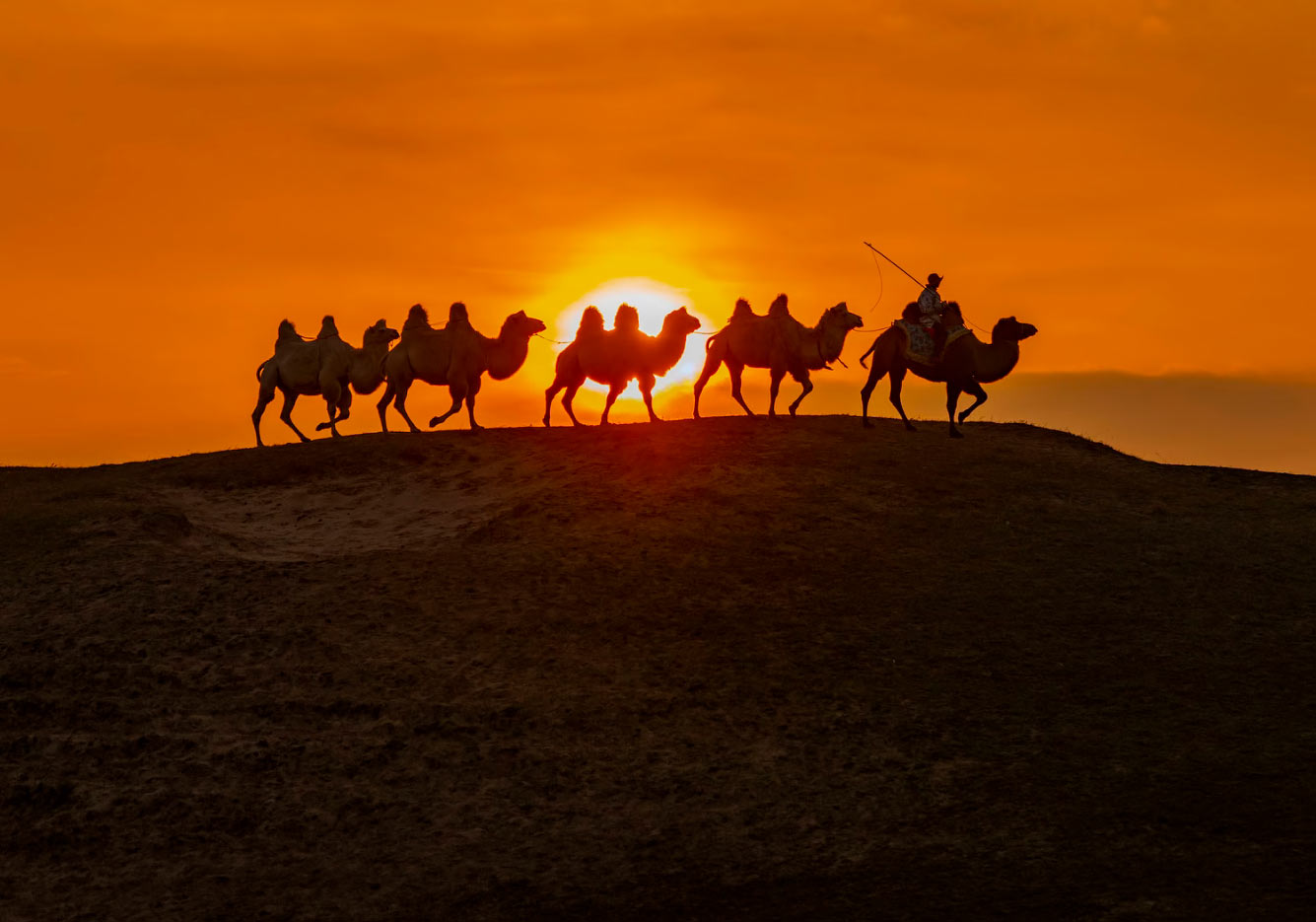 Верблюды возвращаются домой на закате на пастбище Улан-Бутонг в городе Чифэн, автономный район Внутренняя Монголия, Китай. (Фото CFoto / Future Publishing):