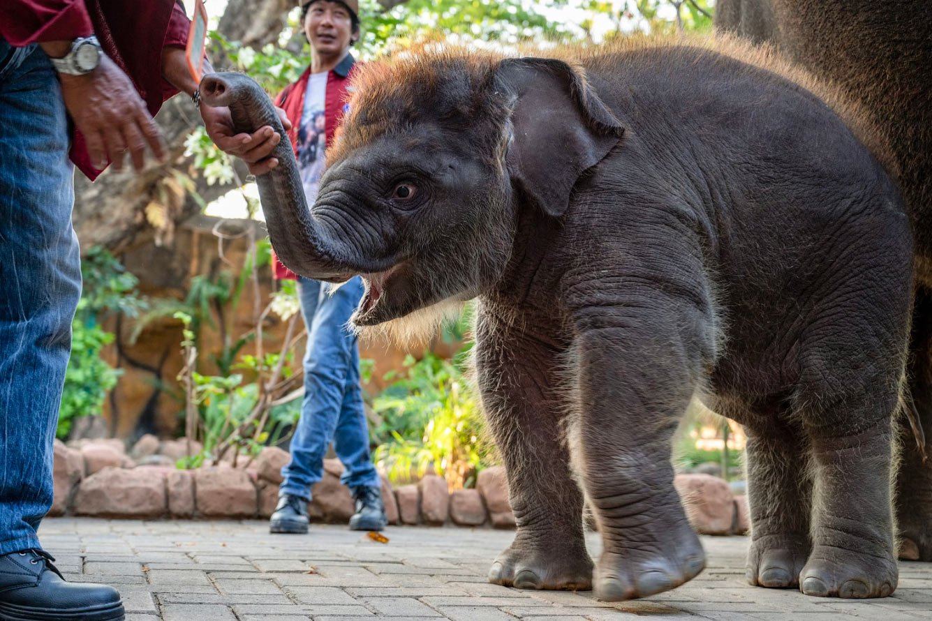 Суматранский слоненок по имени Рокки Бальбоа, родившийся 25 мая 2024 года, стоит рядом со своей матерью, 40-летней слонихой по кличке Лембанг, в зоопарке Сурабаи. (Фото Juni Kriswanto):