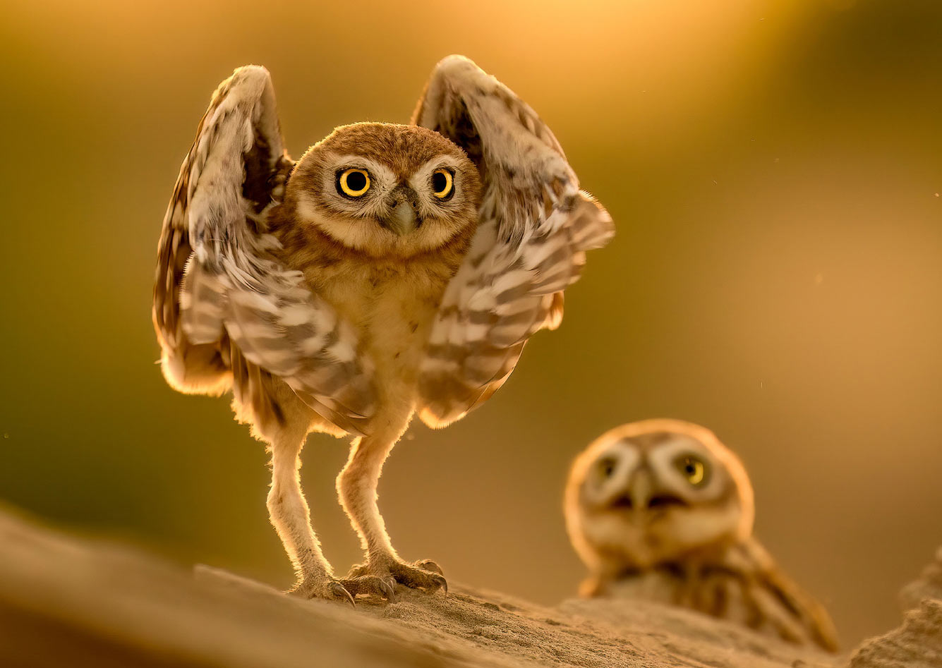 Птенцы маленькой совы расправляют крылья, вылетев из норы в пустынном заповеднике Аль-Мармум в Дубае, ОАЭ. (Фото Anoop Raghavan Manikkoth):