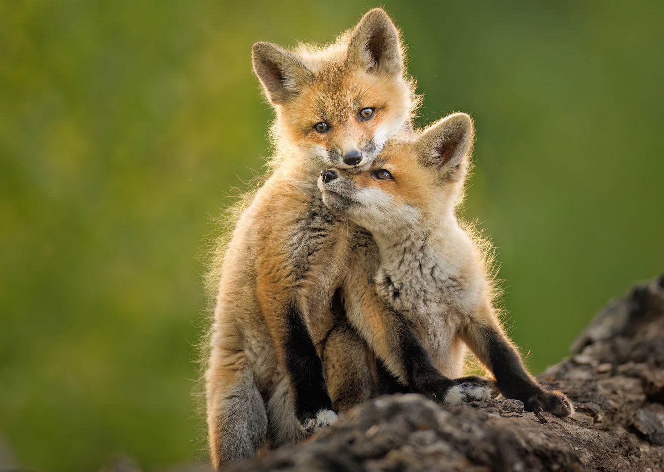 Два лисенка играют вместе в озере Ла-Бич, Альберта, западная Канада. (Фото Donna Feledichuk):