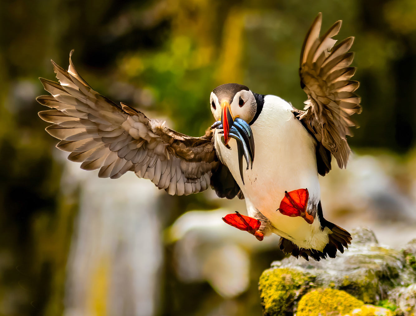 Тупики на острове Мей у побережья Шотландии. Тупики выглядят так, будто откусили больше, чем могут прожевать, с огромными кусками рыбы во рту. Они набили клювы песчанками, чтобы кормить своих птенцов. Птенцов тупиков кормят родители, пока они не будут готовы летать. (Фото Rob McCombe):
