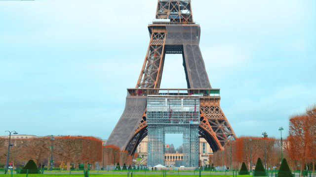 Башне обновили цвет перед Олимпиадой 2024 года. Во время покраски установили леса, которые выглядят так, как будто под башню перенесли Триумфальную арку.