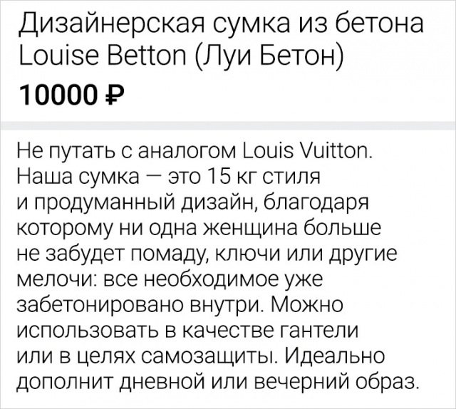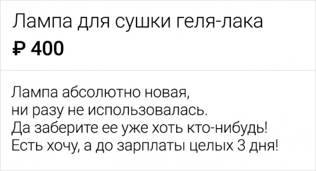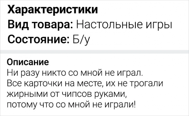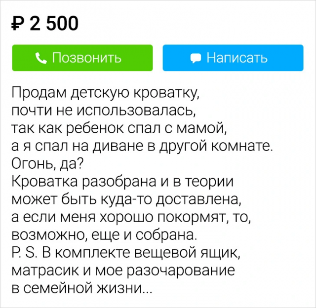 Подборка забавных объявлений, найденных в сети 28/10/2024 22:20 Покупать и продавать вещи в интернете - это дело обыденное. Однако, порой, это очень весело, так так как иногда встречаются такие кадры, что диву даешься. Давайте поднимем себе настроение и поглядим подборку смешных объявлений с просторов Сети. Главная / Картинки 0 Admin 0 156
