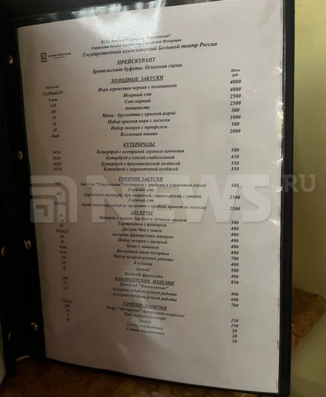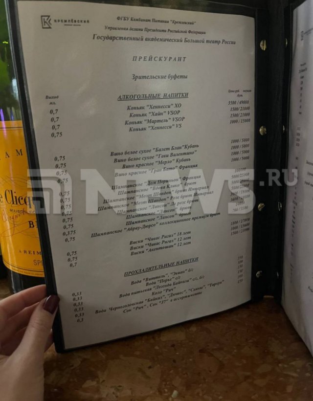 Посетители Большого театра удивляются не только стоимости билетов, но и ценам в буфете. Бокал импортного шампанского стоит 5 тысяч рублей, а за бутылку придется отдать 25 тысяч. Самая дорогая позиция — шампанское "Дом Периньон" за 100 тысяч рублей, хотя в магазинах оно стоит почти вдвое дешевле.