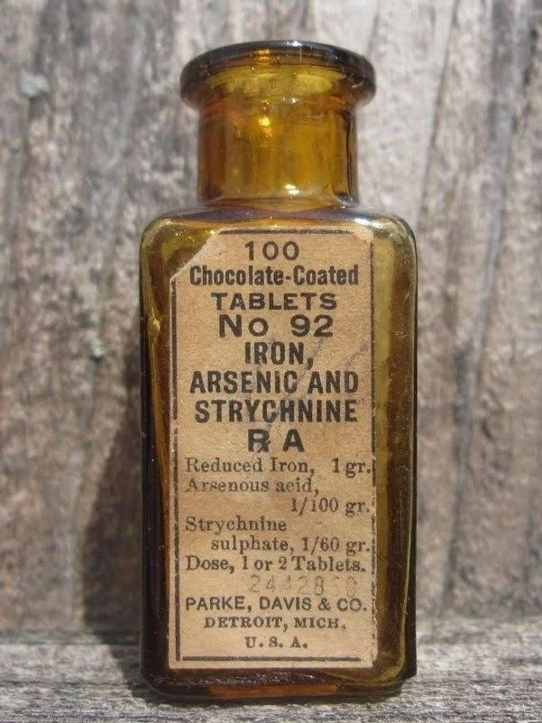 Шоколадные пастилки с железом, мышьяком и стрихнином, произведенные в начале XIX века. Французские врачи считали, что стрихнином, так же, как и хинином, можно лечить различные недуги, включая малярию. К счастью, их заблуждение длилось недолго. Мышьяк же, несмотря на печальную известность своей токсичности, являлся терапевтическим средством, которое с древних времен использовалось для лечения множества заболеваний.