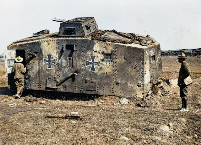 Новозеландские солдаты осматривают немецкий танк по прозвищу "Шнюк", захваченный новозеландскими войсками на Западном фронте, 1918 год.