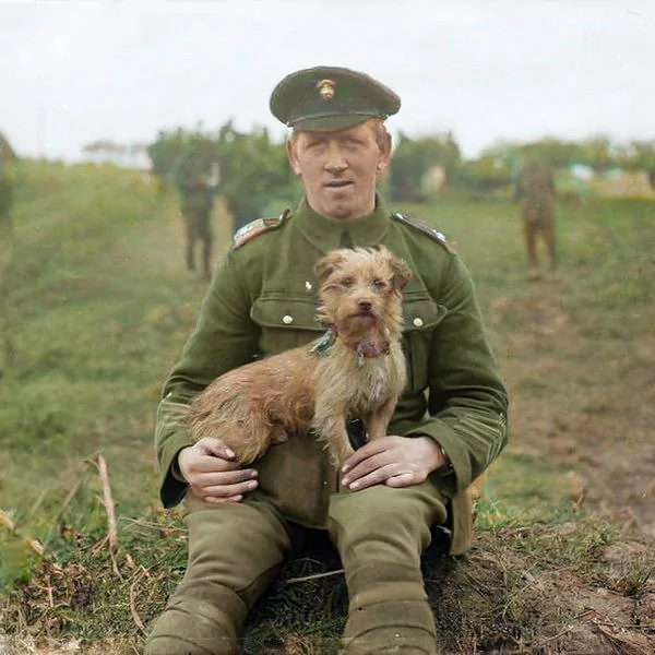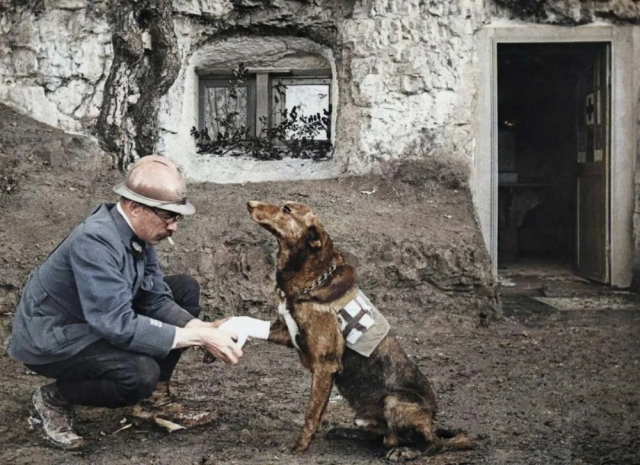 Первая мировая война, солдат перебинтовывает раненую лапу "собаке милосердия", 1917 год.