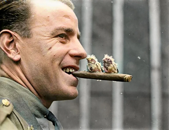 Британский офицер позирует с сигарой и канарейками, 1918 год.
