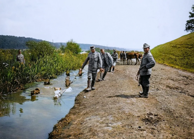Австро-венгерские солдаты купают лошадей. Итальянский фронт Первой мировой, 1917 год.