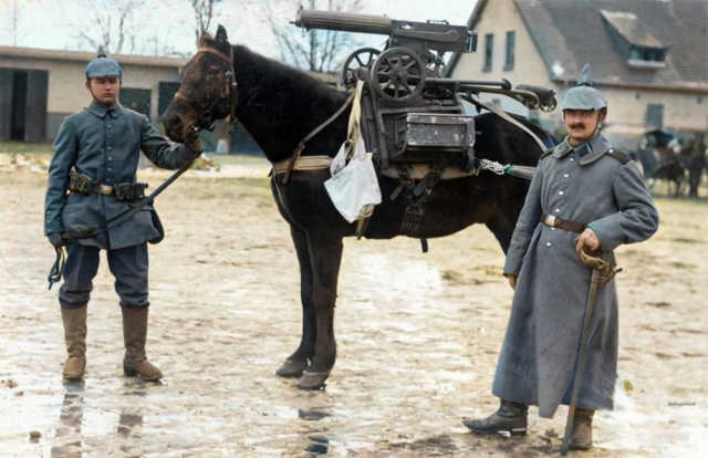 Немецкие солдаты позируют возле коня со специально построенной рамой, на которой размещается трофейный российский пулемет Максим М1910 с колесной установкой и ящиком для боеприпасов.