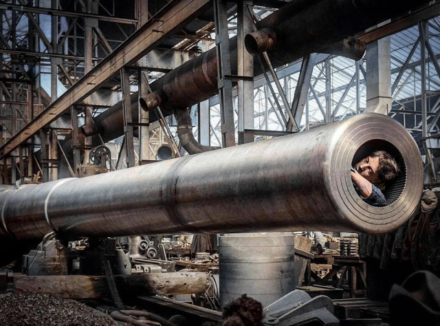 Работник во время чистки нарезов 381-мм орудийного ствола на арсенале в Ковентри. Англия, 1916 год.