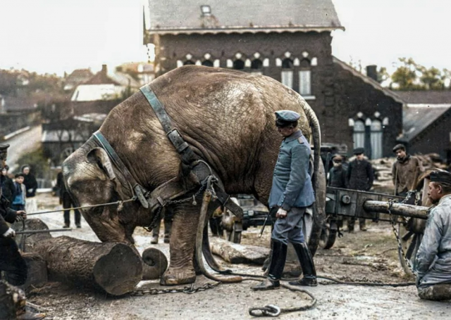 Немецкие солдаты используют индийского слона из зоопарка для переноски стволов деревьев в Валансьене. Франция, 1915 год.
