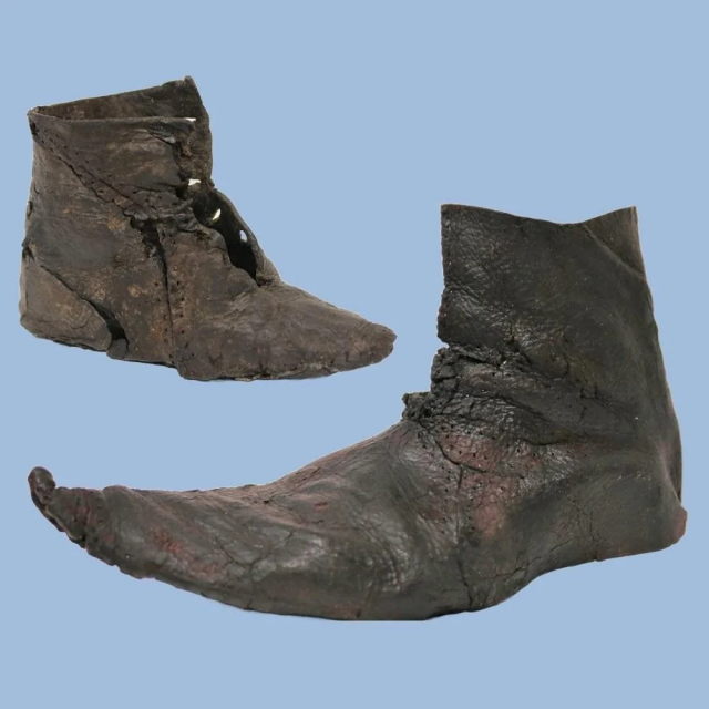 Два средневековых сапога были найдены во время раскопок, проводимых в районе ворот монастыря Святого Бенедикта, Норвич, Англия, в 1951 году. Обувь датируется концом XV века.