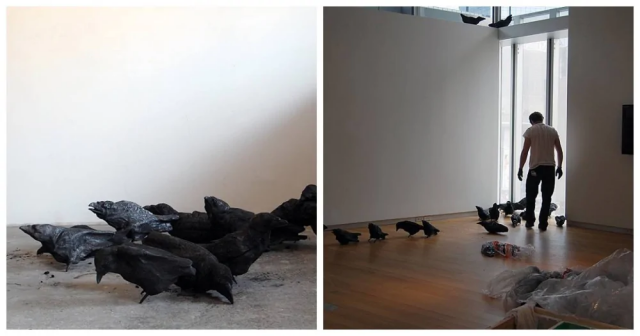 Художник Маскулл Лассерре и его вороны. Художник создал скульптуры чёрных воронов из обожженного дерева и поместил в музей искусств и дизайна в Нью-Йорке.