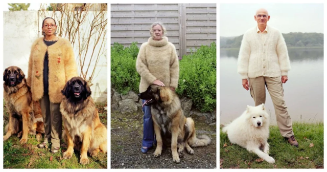 Фотограф Эрван Фишоу создал проект "Собачья шерсть". Это портреты людей, которые носят одежду из шерсти своих собак. Хозяева собирают шерсть годами, а затем создают свитера, жилетки и шубки.