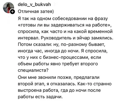 Истории о странных собеседованиях на работу 12/11/2024 21:20 Пройти собеседование — нелегкая задача, особенно когда интервьюеры задают вопросы с подвохом. Предлагаем взглянуть на забавные и порой нелепые истории людей, которые делятся своим опытом прохождения собеседований. Главная / Картинки +1 Admin 0 183