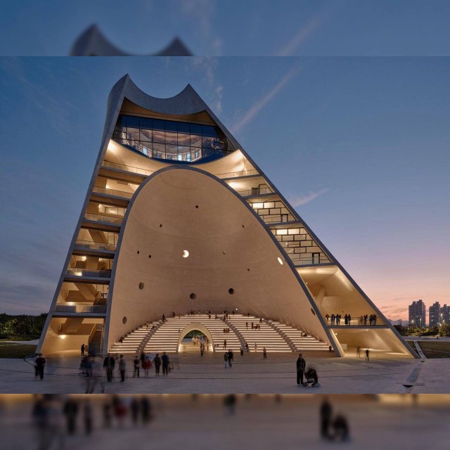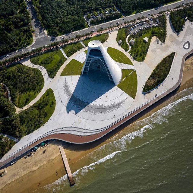 В китайском городе Яньтай завершено строительство уникальной 50-метровой башни. Здание имеет коническую бетонную форму и выполнено по принципу солнечных часов. Но это не все фишки: на крыше находится библиотека под названием Phenomens Space и полуоткрытая смотровая площадка с панорамным видом на окрестности.