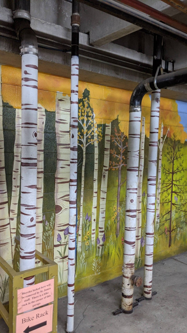 В этом парковочном гараже трубы окрашены в тон фреске с изображением берёз