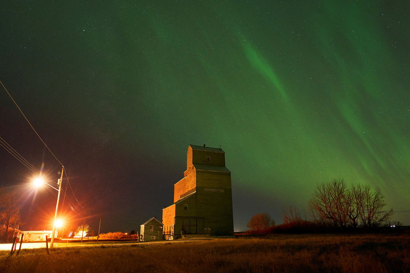 Северное сияние, также известное как полярное сияние, освещает небо над старым элеватором в Бранте, Альберта, Канада. (Фото Todd Korol):