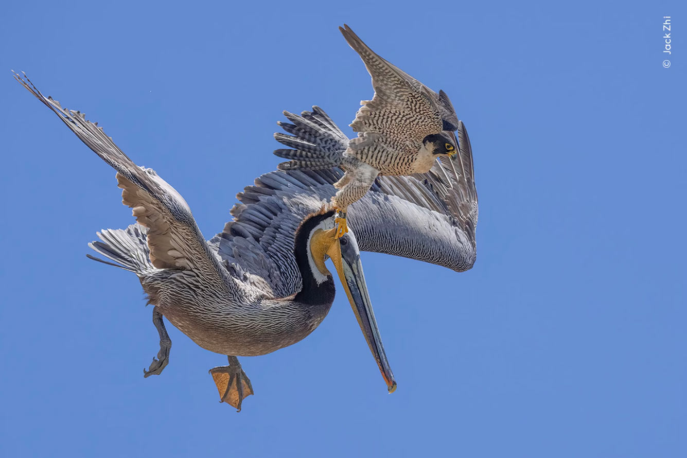 Джек Чжи заснял момент, когда сокол зацепился когтями в пеликана пеликана и потянул его вверх. Джек некоторое время наблюдал за этим сапсаном, видел, как он нападает на чаек, скоп и орлов, которые подлетали слишком близко к его гнезду на близлежащем выступе скалы. (Фото © Jack Zhi / Wildlife Photographer of the Year):
