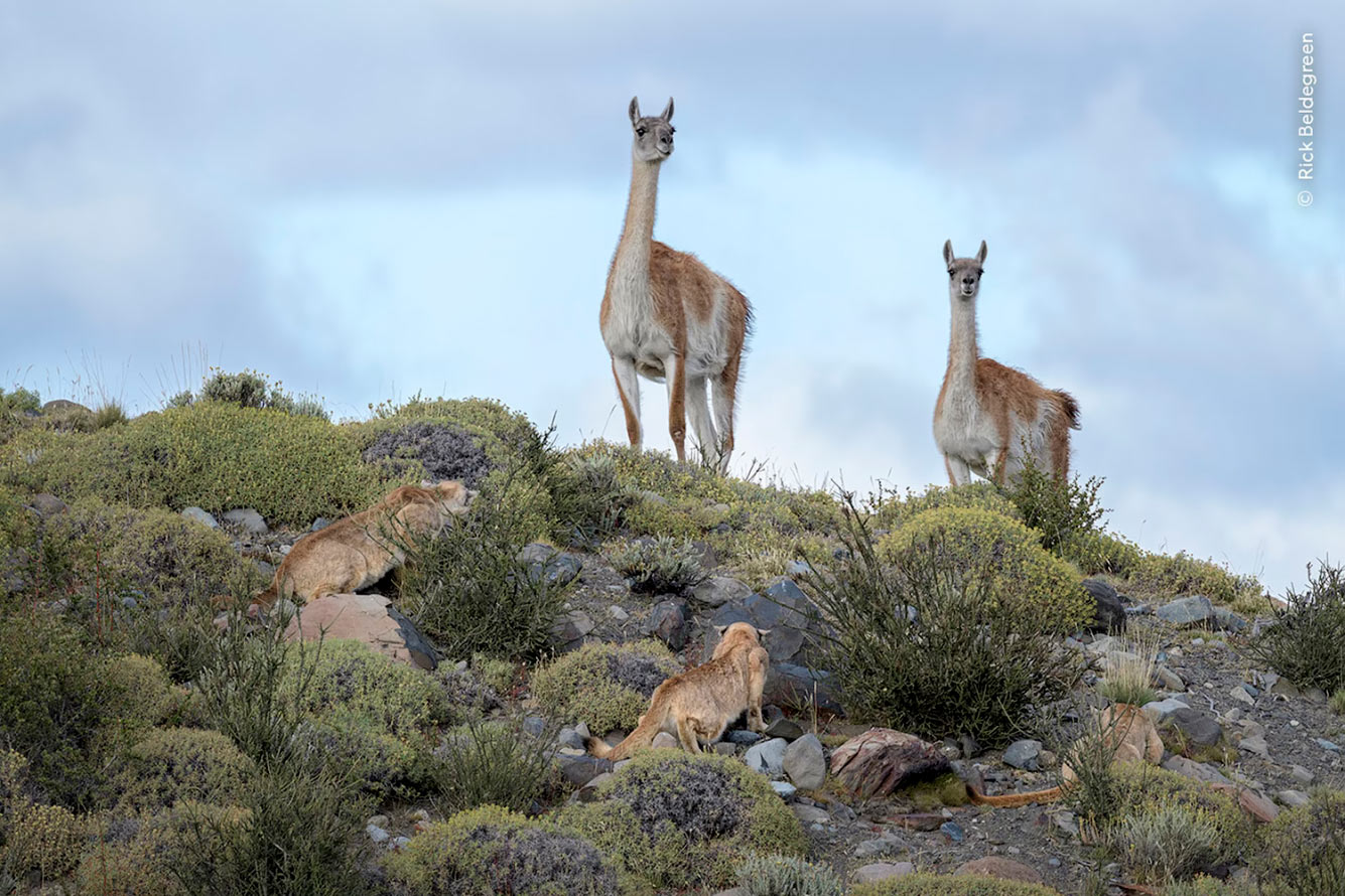Рик Белдегрин стал свидетелем того, как группа детенышей пумы преследовала свою потенциальную добычу гуанако. Он выслеживал пуму и ее трех детенышей в течение нескольких дней, когда увидел эту сцену. Увидев пуму, гуанако переместились на возвышенность, но не заметили детенышей, в нескольких метрах от своей точки наблюдения. (Фото © Rick Beldegreen / Wildlife Photographer of the Year):