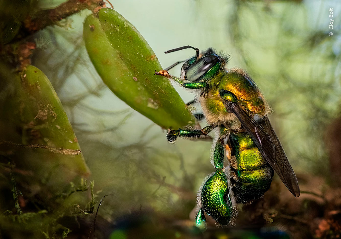 Орхидейная пчела. Клей провел много лет, фотографируя тропических пчел. Используя органические запахи, смешанные учеными для привлечения и наблюдения за бабочками и молью, у него было несколько секунд, чтобы сфотографировать пчелу, когда она стояла и собирала масла, прежде чем она улетела. (Фото © Clay Bolt / Wildlife Photographer of the Year):